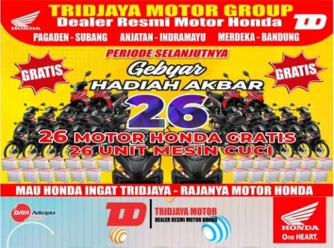 Tak hanya promo pembelian, Tridjaya Motor Group juga kembali melanjutkan program tahunan Gebyar Hadiah Akbar, dengan hadiah utama 26 unit motor Honda gratis dan 26 unit mesin cuci, yang akan diundi untuk pelanggan setia di seluruh jaringan dealer Tridjaya Motor yang tersebar di Pagaden, Subang, Anjatan, Indramayu, Merdeka, hingga Bandung.
